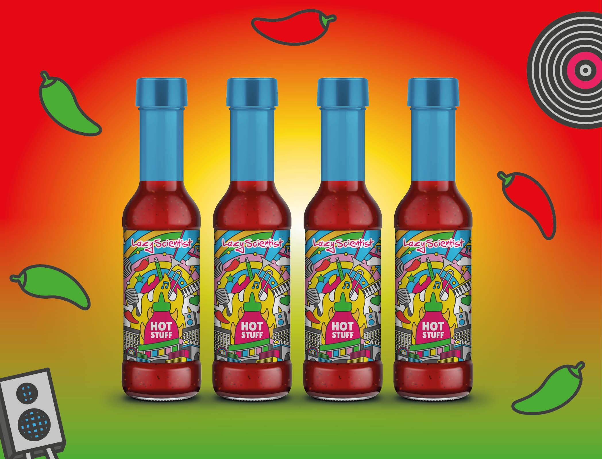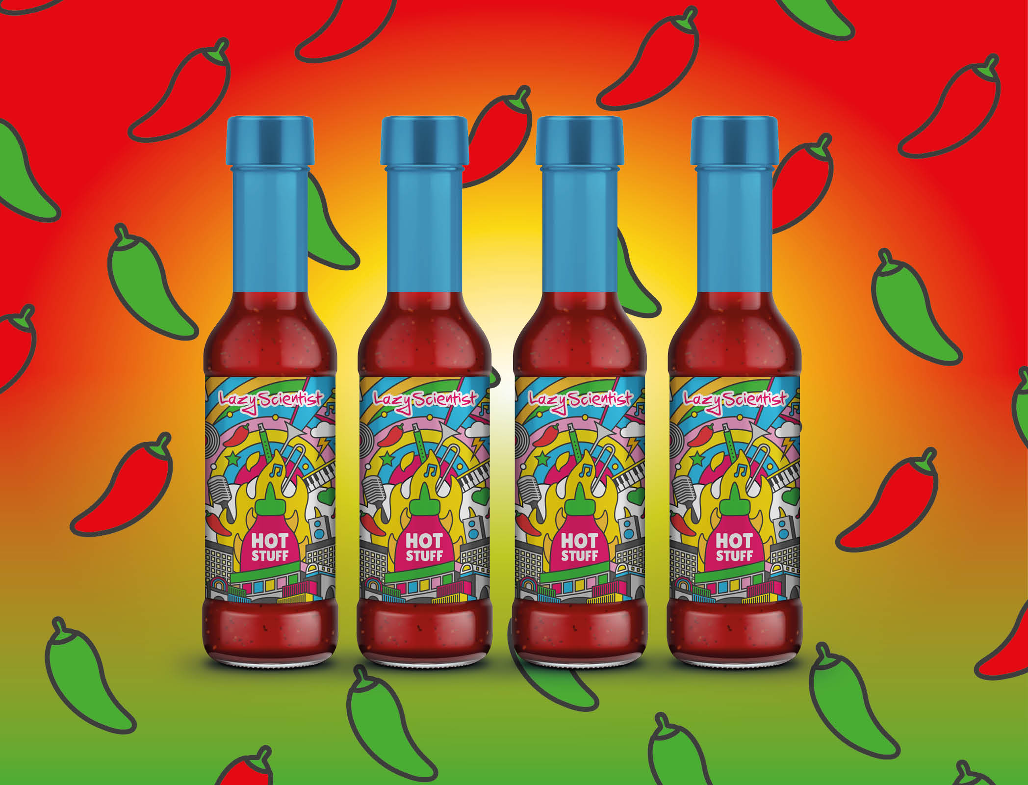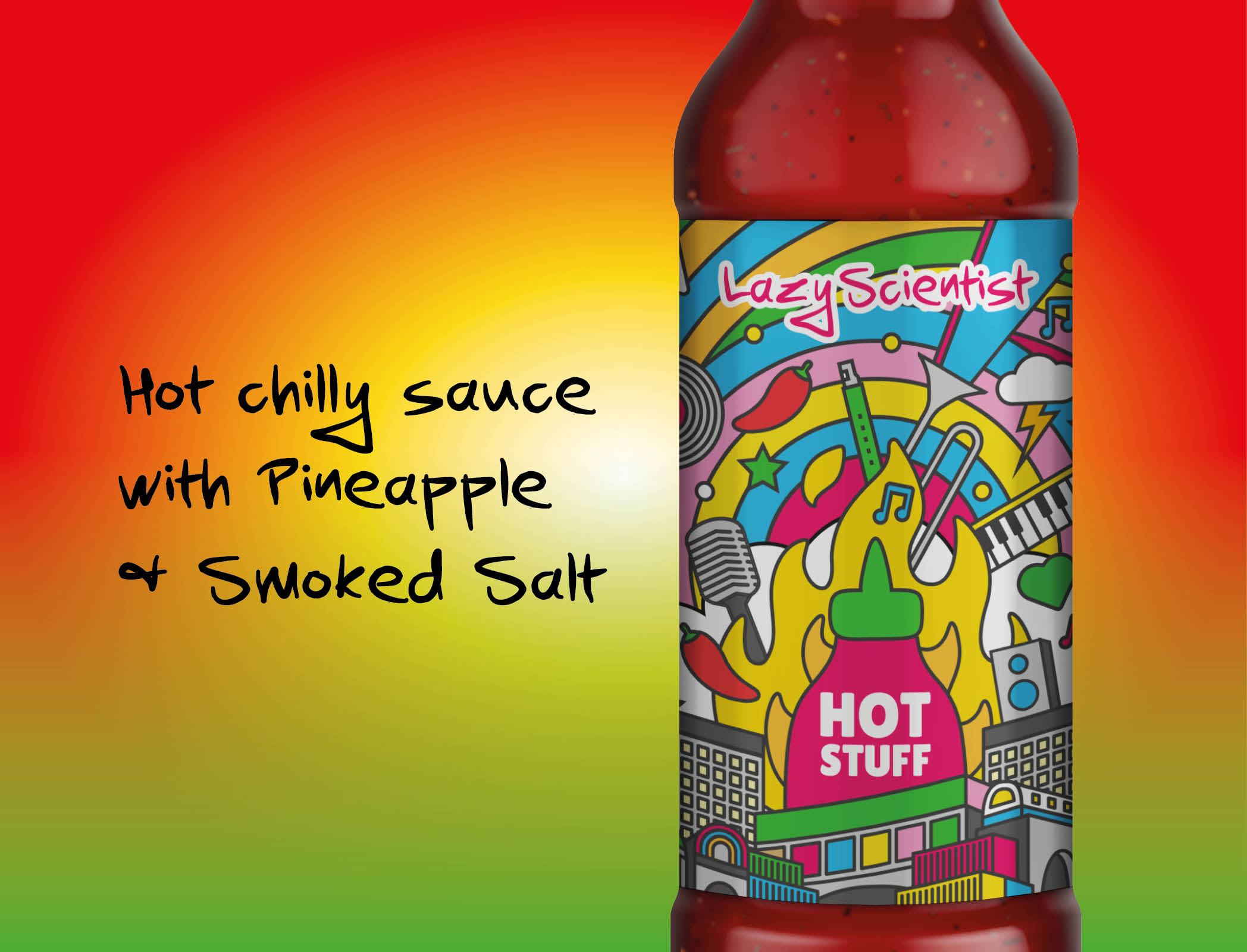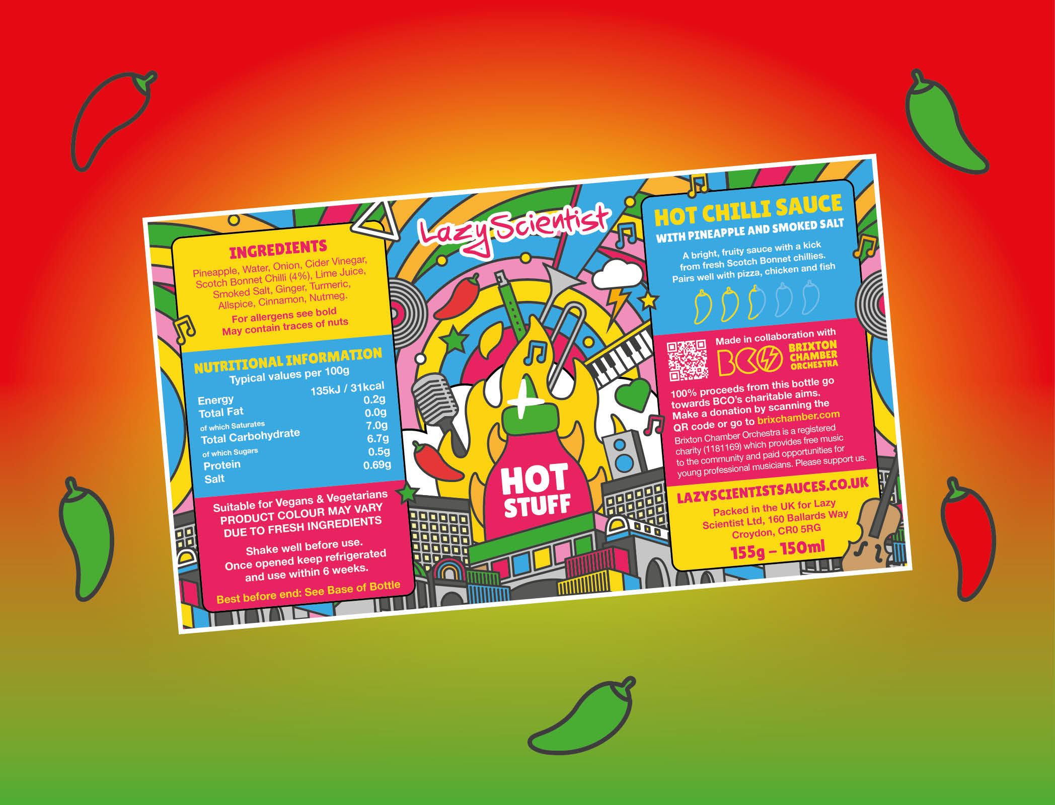 Yet another project I worked on for my friends at Brixton Chamber orchestra. This time, a collaboration with a London based producer of amazing Chilly sauce. Using the graphics produced for their debut single, I adapted it to be used for a special release of a limited edition run of a sauce with an extra special recipe. It’s delicious, can highly recommend The Lazy Scientists exceptional sauces and recipes.